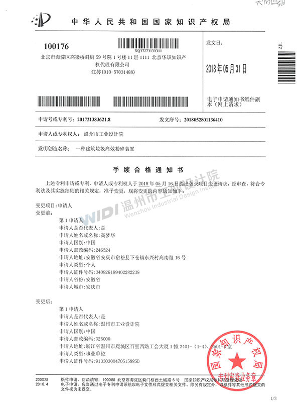 一種建筑垃圾高效粉碎裝置手續(xù)合格通知書(shū) (1)