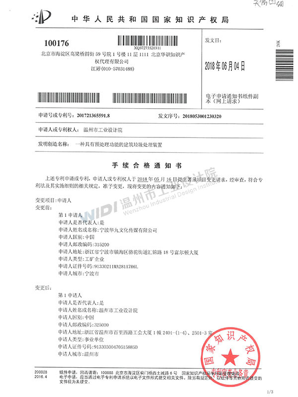 一種具有預(yù)處理功能的建筑垃圾處理裝置手續(xù)合格通知書(shū) (1)