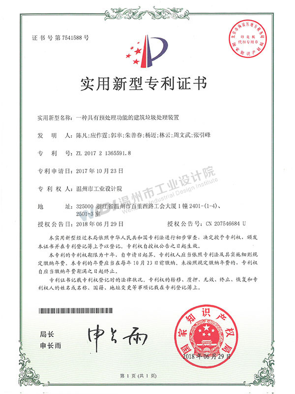 一種建筑垃圾高效粉碎裝置證書(shū)