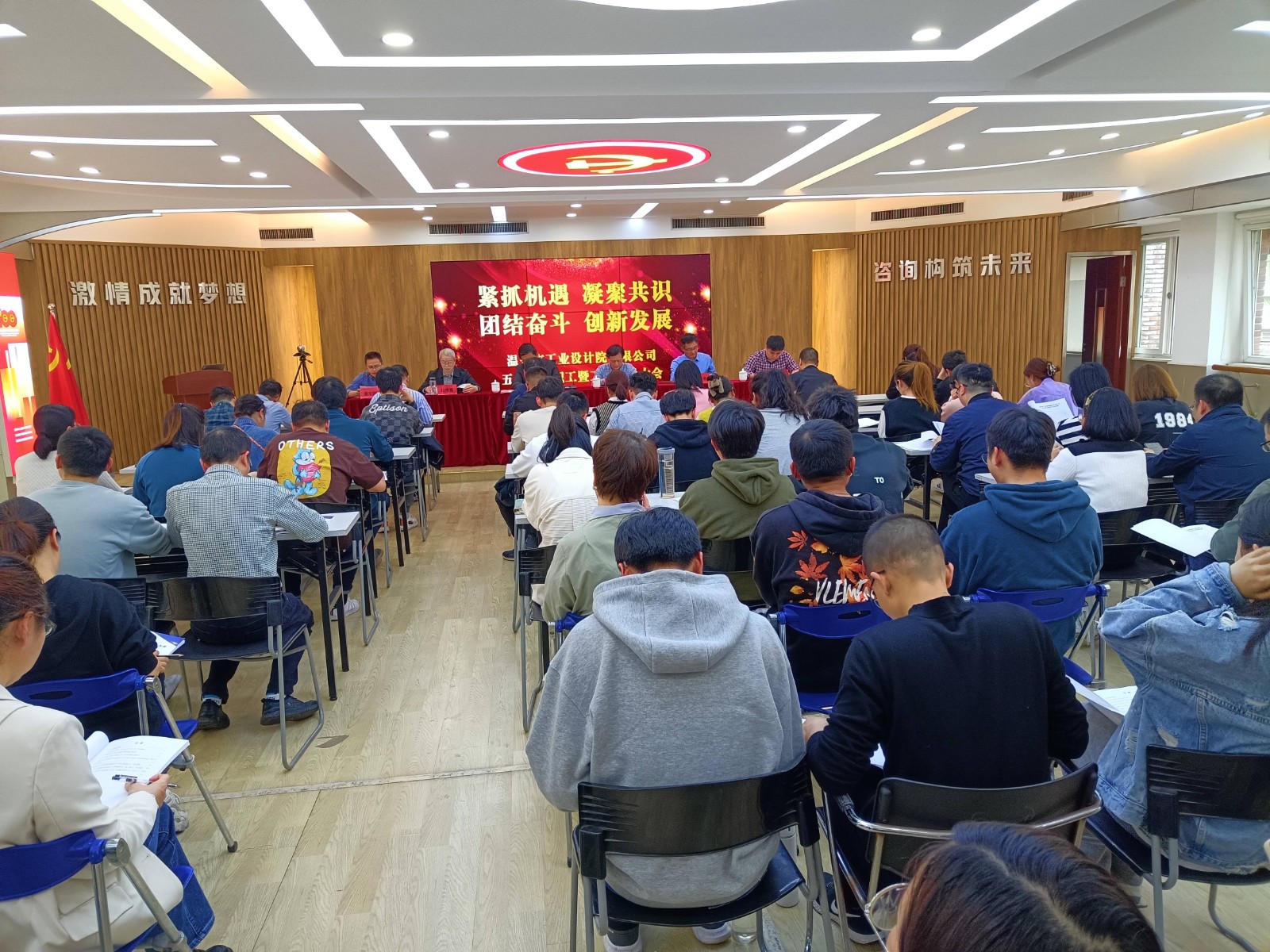 4月14日下午,在莊嚴(yán)的國歌聲中,工業(yè)院第五屆二次職工暨工會(huì)會(huì)員大會(huì)隆重召開??偨?jīng)理吳家強(qiáng)、副總經(jīng)理張曉武等領(lǐng)導(dǎo)班子成員和全體員工出席會(huì)議,會(huì)議由副總經(jīng)理、工會(huì)主席董文燁主持。